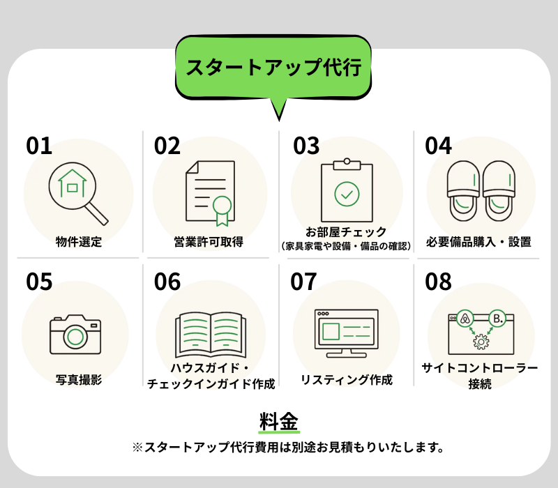 開業準備・運営代行・集客・法令対応から、予約管理・清掃までワンストップでサポート。